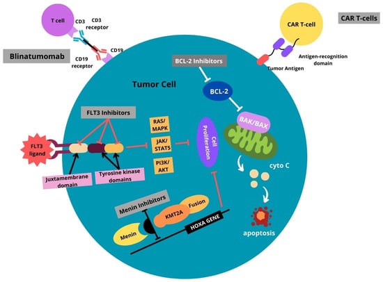 Summary of novel approaches for infant ALL treatment. FLT3 ligand, Fms-related tyrosine kinase 3 ligand; FLT3 inhibitors, Fms-related tyrosine kinase 3 inhibitors, RAS/MAPK, Ras/mitogen-activated protein kinase; JAK/STAT5, Janus kinase/signal transducer and activator of transcription 5; PI3K/AKT, Phosphoinositide 3-kinases/Serine/threonine kinase; KMT2A, histone-lysine N-methyltransferase 2A; BCL-2, B-cell lymphoma 2; BCL-2 inhibitors, B-cell lymphoma 2. Image created with Canva Pro https://www.canva.com/pro/ (accessed on 29 January 2024).