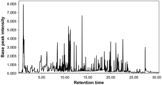 Base peak chromatogram of cherry stem extract. The chromatogram of the cherry stem extract is included in the Supplementary Materials (Figure S1), enlarged and numbered for better visualization of the individual chromatographic peaks. Due to the sensitivity of the HPLC-ESI-qTOF-MS technique performed and the fragments obtained, a detailed characterization of the cherry stem extract could be carried out.