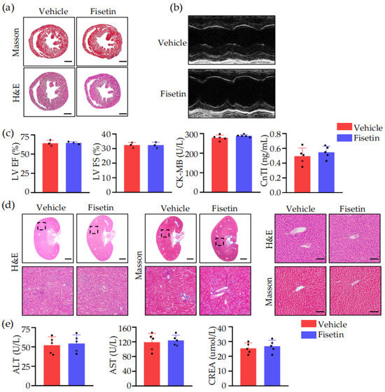 Currently, its potential toxicity to the heart, liver, and kidneys remains unknown. Therefore, 24 h after surgery, we performed H&E and Masson staining on the hearts, livers, and kidneys of WT mice pretreated with Fisetin or vehicle, conducted ultrasound examination of mouse hearts, and tested their blood. It was found that Fisetin did not cause significant pathological changes in the hearts, livers, or kidneys, and there was no significant impact on index such as ejection fraction (EF), fractional shortening (FS), creatine kinase-MB (CK-MB), cardiac troponin I (CTnI), alanine aminotransferase (ALT), aspartate aminotransferase (AST), or creatinine (CREA) (Figure 2).