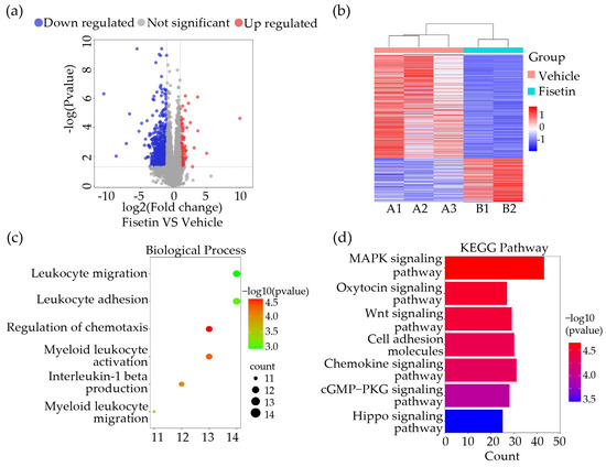 To further investigate the mechanism by which Fisetin regulates thrombus formation, we performed RNA sequencing experiments to measure molecular changes in gene expression levels 24 h after IVC ligation in treated and untreated mouse groups. Setting p value < 0.05, log2FoldChange ≤ −0.58 and log2FoldChange ≥ 0.58, we found a total of 611 down-regulated differentially expressed genes (DEGs) and 114 up-regulated DEGs in thrombi of the Fisetin-treated group compared to the vehicle group (Figure 3a,b). Gene ontology (GO) biological pathway enrichment analysis of all DEGs between Fisetin and vehicle groups revealed that Fisetin appeared to affect leukocyte activation and adhesion (Figure 3c). Next, we conducted enrichment analysis of RNA-seq results using the Kyoto Encyclopedia of Genes and Genomes (KEGG) database to explore pathways involved in Fisetin’s role in thrombus formation, suggesting Fisetin might participate in the mitogen-activated protein kinase (MAPK) signaling pathway (Figure 3d). These results indicated that Fisetin is closely associated with the inflammatory response during thrombus formation in mice.