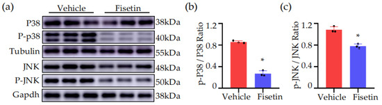 Fisetin inhibited MAPK signaling pathway in DVT mice model. (a) Representative Western blots for p-P38, P38, p-JNK, and JNK protein expressions in thrombi tissue extracts (n = 3). (b,c) The quantification of p-P38, P38, p-JNK, and JNK protein Western blots (n = 3). All data are presented as means ± SD. * p < 0.05.