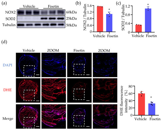 Fisetin reduced ROS in the DVT mouse model. (a) Representative Western blots for NOX2 and SOD2 protein expressions in thrombi tissue extracts (n = 3). (b,c) The quantification of NOX2 and SOD2 protein Western blots (n = 3). (d) Representative images of dihydroethidium (DHE) staining of thrombi. Scale bar, 250 μm (n = 4). The ROS production in the thrombus was quantified and presented as the mean fluorescence intensity. All data are presented as means ± SD. * p < 0.05.