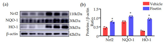 After confirming the antioxidant effect of Fisetin, we further explored its potential mechanism. NRF2 plays a crucial role in the antioxidant system [11]. Under oxidative stress, activated NRF2 translocates to the nucleus, leading to the expression of enzymatic antioxidants, including heme oxygenase-1 (HO-1) and NAD(P)H quinone oxidoreductase-1 (NQO-1) [12]. The results showed that compared to the model group, the Fisetin-treated group significantly activated NRF2 signaling transduction and increased the expression level of HO-1 and NQO-1 (Figure 8a,b). These results suggested that the antioxidant effect of Fisetin associated with the activation of the NRF2 signaling pathway.