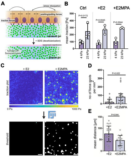 Steroid hormones affect the traction force patterns of Ishikawa monolayers. (A) The scheme depicts the principle of traction force microscopy (TFM). Cells were seeded on top of polyacrylamide (PAA) gels that contained fluorescent beads and an image of this stressed gel was obtained. After detaching the cells with SDS, the bead position in the relaxed gel was imaged. Cell-substrate stresses (tractions) could be calculated from bead displacement. (B) The bar graph shows the mean traction forces of Ishikawa monolayers grown on top of 4 kPa and 23 kPa polyacrylamide gels without hormone treatment or treatment with estradiol (E2) or a combination of estradiol and medroxyprogesterone acetate (E2MPA) for 5 days before analysis (data obtained by 3 independent experiments with at least 6 measurements per experimental condition; mean ± SD, one-way ANOVA). (C) Traction force heat maps of Ishikawa monolayers after hormone treatment. Scale bars = 50 µm. (D,E) The plots show the total number of force hotspots per mm2 and the mean Euclidian distance between hotspots in Ishikawa cells after steroid hormone treatment. Error bars represent the interquartile range (D) or standard deviation (E). Data were obtained in at least 3 independent experiments with 3 technical replicates per condition; Mann–Whitney U test (D) or unpaired t-test (E).