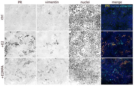 Progesterone receptors and vimentin are restricted to single cells and small cell clusters in Ishikawa monolayers. The fluorescence images of Ishikawa monolayers show the distribution of the progesterone receptor (PR; orange), vimentin (cyan), and nuclei (Hoechst 33342; blue). Monolayers were either untreated (ctrl) or stimulated with estradiol (E2) or a combination of estradiol and medroxyprogesterone acetate (E2MPA) for 5 days. The confocal images are displayed as maximum intensity projections (Z-step interval = 1.5 µm). Scale bars = 25 µm.