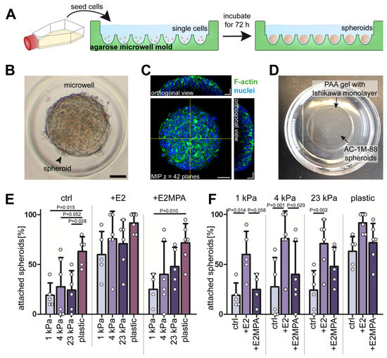 To find out how substrate stiffness and hormone-dependent heterogeneity cooperate to modulate endometrial receptivity, we employed a confrontation assay in which we placed trophoblast-derived choriocarcinoma/hybridoma AC-1M-88 spheroids on Ishikawa monolayers. To standardize the assay, we grew spheroids in a scaffold-free system (Figure 5A). Dissociated AC-1M-88 cells were seeded into 300 µm diameter agarose-based micromolds and grown for 3 days. Cells aggregated during this time and formed compact spheroids (“trophospheres”) of 160 ± 15 µm in size. (Figure 5B,C). Twenty spheroids were individually placed with a micropipette at regular spacing on top of Ishikawa cell monolayers (Figure 5D). After incubation for two hours, non-adherent spheroids were flushed off by repeated rigorous washing of the monolayers with PBS. The remaining attached spheroids were counted. Using this assay, we found that trophospheres attached more firmly to Ishikawa monolayers growing on stiff matrices. This effect was observed in the non-stimulated and hormone-treated Ishikawa cells (Figure 5E). Trophosphere adhesion was highest in monolayers treated only with estradiol (Figure 5F).