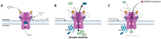 N-methyl-d-aspartate receptor (NMDAR) and its ligand binding sites. (A) NMDAR at resting potential is blocked by Mg2+. (B) NMDAR is activated by AMPAR-induced depolarization and binding of both Glu and Gly/D-Ser. Activation results in opening of channel and allows for voltage-dependent release of Mg2+ out of ionophore and Ca2+ influx into cell, inducing activation of PSD-95, signaling kinases, and mediating synaptic plasticity. (C) NMDAR uncompetitive antagonist binds PCP site and partially blocks influx of Ca2+ thus preventing neuronal membrane depolarization and downstream signaling mechanisms. Adapted from [,,,].
