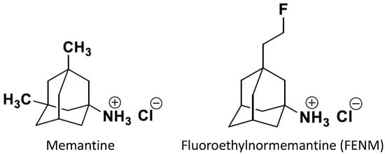 Memantine and several derivatives have been fluorinated with a positron-emitting isotope 18F and tested as radiotracers of positron emission tomography (PET) for the in vivo labeling of NMDARs [,,]. 18F-memantine was homogeneously distributed in the cortex and basal ganglia regions, as well as the cerebellum. However, the observed pattern of 18F-memantine uptake in the whole brain was not consistent with autoradiographic studies performed on post-mortem human brains with another NMDAR radiotracer, 3H-TCP [], and did not reflect the regional NMDAR distribution [,,]. Moreover, the radioligand binding was partly displaced by haloperidol, suggesting some binding at sigma-1 receptors []. Therefore, the radiotracer did not appear suitable for the PET imaging of the NMDA receptors. Among derivatives, 18F-fluoroethylnormemantine (18F-FENM, Figure 3) showed an excellent selectivity and specificity for NMDAR in preclinical models in vivo. 18F-FENM effectively crosses the blood–brain barrier after intravenous administration and to bind to the grey matter, cerebellar cortex, and central grey nuclei [,]. Its specific distribution matched the one of the GluN1 subunit, and a low non-specific binding level was seen after pre-injection with ketamine at anesthetic doses. Moreover, FENM competed in vitro with 3H-TCP in rat brain membranes with a Ki of 3.5 µM []. As observed for memantine, FENM was poorly metabolized in vivo with a good stability in plasma and the level of plasma protein binding. However, as compared with other PET radiotracers, it showed a low effective dosimetry dose []. Moreover, the tracer was used recently in a preclinical model of excitotoxicity induced in Sprague Dawley rats by stereotaxic quinolinic acid injections into the left motor area []. PET imaging detected a significant increase in the 18F-FENM uptake 24 h and 72 h after excitotoxic lesions compared to the control group. So, although FENM showed only a moderate affinity for the PCP site, the tracer appeared suitable to track NMDAR activation in neurodegenerative and neurological diseases.