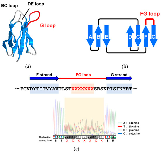 Construction of an adnectin-derived phage display library: (a) the structure of adnectin. The FG loop is known to be the longest loop in adnectin and plays an important role in target binding; (b) adnectin forms a β-sandwich structure consisting of seven β-strands. The structure of adnectin is similar to that of the target recognition site of antibodies; (c) sequence analysis of the FG loop of the constructed adnectin library.