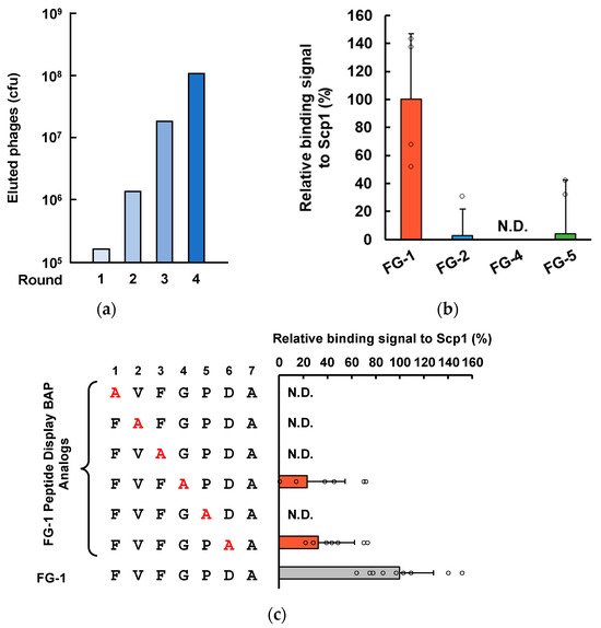 Isolation of Scp1-specific adnectin using a randomized adnectin-derived phage display library: (a) the process of screening for Scp1-binding phage; (b) binding analysis with FG loop sequence peptide-conjugated BAP (n = 4); (c) identification of the contributed amino acid residues to the binding of Scp1 by substitution Ala residue using peptide-BAP conjugates (n = 9). Amino acids subjected to replace Ala residue are colored in red. Analogs that showed binding signal to Scp1 are highlighted in orange. N.D., non-detectable.