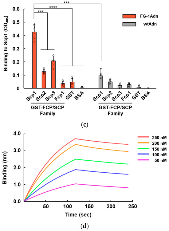 In vitro functional analysis of FG-1Adn: (a) SDS-PAGE of recombinant FG-1Adn targeting Scp1. The recombinant proteins expressed by E. coli system were recovered with high purity.; (b) the binding ability of recombinant FG-1Adn and wtAdn to Scp1 (n = 9). Statistical significance was asserted between the indicated adnectin and target proteins by two-way ANOVA with Tukey’s post hoc test. ****: p < 0.0001. The data are presented as the mean ± SEM; (c) specificity of FG-1Adn and wtAdn recombinant proteins in FCP/SCP family. Scp2 and Scp3 are isoforms of Scp1 (n = 6). Statistical significance was asserted between the indicated adnectin and target proteins via two-way ANOVA with Tukey’s post hoc test. ***: p < 0.001, ****: p < 0.0001. The data are presented as the mean ± SEM; (d) binding assays of FG-1Adn to Scp1 by biolayer interferometry. Scp1 was measured in the presence or absence of biotinylated FG-1Adn. The measurement was performed in the Advanced Kinetics mode of the BLItz system using streptavidin biosensor chips.