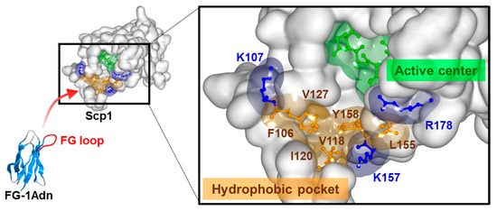 In this study, we constructed a phage library containing the antibody-mimetic protein adnectin and identified Scp1-specific binding molecules using the library. In the adnectin-derived phage library, the FG loop of adnectin contained randomized amino acid residues, and this loop is known to contribute the most to sequence tolerance and binding to the target molecule [40,49]. Biopanning revealed that the FG loop peptide sequence from FG-1Adn, which was detected at the highest frequency when Scp1 bound to adnectin, showed the highest binding ability to Scp1. Ala scanning analysis of the heptad peptide (Phe1-Val2-Phe3-Gly4-Pro5-Asp6-Ala7) derived from the FG loop of FG-1Adn showed that Phe1-Val2-Phe3 and Pro5 play important roles in Scp1 binding (Figure 4a). CTDpS5-containing peptide (Tyr1-Ser2-Pro3-Thr4-pSer5-Pro6-Ser7) derived from RNAPII, known as an Scp1 substrate, has been reported to bind to the groove of the Scp1 active site through its Ser2-Pro3-Thr4-Ser5 residues in the sequence [23]. In particular, the hydrophobic interaction between Pro3 and the Scp1 hydrophobic pocket is important for the binding of CTDpS5 to Scp1. The fact that the Pro3 residues of FG-1Adn were highly conserved, even within the FG loop sequence of the Scp1-binding adnectin candidates identified in this study, also supports the notion that hydrophobic residues, including the Pro3 residues of FG-1, bind to the hydrophobic pocket close to the active center. In addition, the acidic residue Asp6 of FG-1Adn in the C-terminal region of the FG-1 peptide sequence may interact with basic residues located in the substrate-binding pocket of Scp1. Several basic residues were located around the substrate-binding hydrophobic pocket near the active center of Scp1 (Figure 6). These data suggest that electrostatic interactions through residues near these hydrophobic regions may also play important roles in the binding between FG-1Adn and Scp1. In addition, the Lineweaver–Burk plot analysis and the results of the competition study with rabeprazole supported that FG-1Adn binds to the hydrophobic region near the active center. In the Lineweaver–Burk plot analysis, the lines for the addition of different concentrations of FG-1Adn did not intersect on the x-axis but in the second quadrant. These results suggested that FG-1Adn functions as a non-competitive-like inhibitor and that FG-1Adn is an inhibitor with a higher affinity for the enzyme alone than for the substrate-enzyme complex.