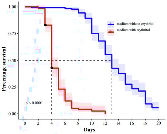 A total of 120 flasks (3600 flies) were collected, with half designated for the experimental group fed with erythritol medium and the other half for the control group fed with normal medium. These flasks were then placed in an incubator at a temperature of 25 ± 1 °C, under a photoperiod of 12 h of light followed by 12 h of darkness. The relative humidity was maintained at 70 ± 5%. Daily fly survival numbers were counted, and survival analysis was performed using the Kaplan–Meier method using the survival R package version 3.5-7.
