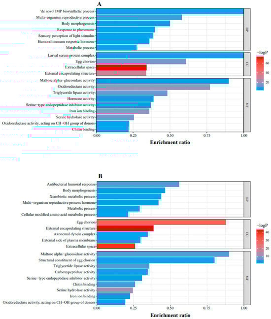 (A) GO enrichment results between erythritol-treated flies and control flies after 72 h. (B) GO enrichment results between erythritol-treated flies and control flies after 96 h. BP: biological process, DEGs: differentially expressed genes, CC: cellular component, MF: molecular function, enrichment ratio: the ratio of DEGs enriched into GO term to all genes in GO term.