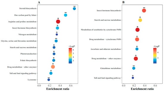 (A) KEGG pathway enrichment results between erythritol-treated flies and control flies after 72 h. (B) KEGG pathway enrichment results between erythritol-treated flies and control flies after 96 h, DEGs: differentially expressed genes, enrichment ratio: the ratio of DEGs enriched into KEGG pathways to all genes in KEGG pathways, +: up-regulated pathway, −: down-regulated pathway.