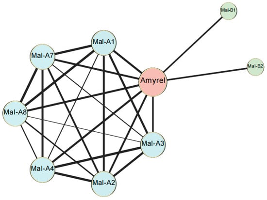 Interactions of key enzymes associated with starch and sucrose metabolism. The amylase gene Amyrel is linked to all other maltase genes in the pathway and is a hub gene of the pathway. Mal-A1, Mal-A2, Mal-A3, Mal-A4, Mal-A7, and Mal-A8 are all linked to each other.