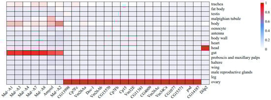 Heatmap of RNA-Seq data deconvolution results. The expression values of the genes in the 17 tissues were normalized to a range of 1 to 0, with 1 indicating the largest expression value. Mal-A1, Mal-A2, Mal-A3, Mal-A4, Mal-A7, Mal-A8, and Amyrel are highly expressed in the gut. Dilp2 is highly expressed in the head. Other genes associated with egg laying are highly expressed in the ovary.