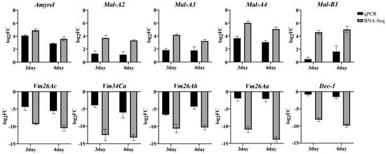 To validate the reliability of DEGs identified in transcriptome analysis, the expression profiles of ten key genes associated with starch metabolism (Amyrel, Mal-A2, Mal-A3, Mal-A4, and Mal-B1) or egg formation (Vm26Ac, Vm26Ab, Vm26Aa, Vm34Ca, Dec-1) were determined using qRT-PCR. Our results showed that gene expression levels in the RNA-seq data were significantly correlated with their expression detected by qRT-PCR (Figure 7).