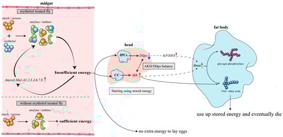 A rational mechanism has been proposed to explain the relationship between Dilps and Akh in the fly. Dilps and Akh are two counter-regulatory molecules that regulate glucose level in the fat body []. Starvation (or energy deficiency) can induce the expression of Akh, promoting glycolysis. In addition, Akh can regulate the expression of Bmm, which catabolizes lipids and maintains the energy balance. Therefore, the balance between Dilps and Akh may be important for resource allocation into growth and reproduction. In this study, competitive binding of erythritol and maltase to sucrose and/or maltose significantly inhibited their hydrolysis, resulting in energy deprivation. The energy deprivation signal triggered higher expression of FOXO, Akh and Bmm but suppressed the expression of Dilp2, Dilp3 and Dilp5, indicating that stored lipids and glycogen were overused. The combined effects of the depletion of stored lipids and the failure of dietary sugars to provide sufficient energy accelerated the mortality of the fly (Figure 8).