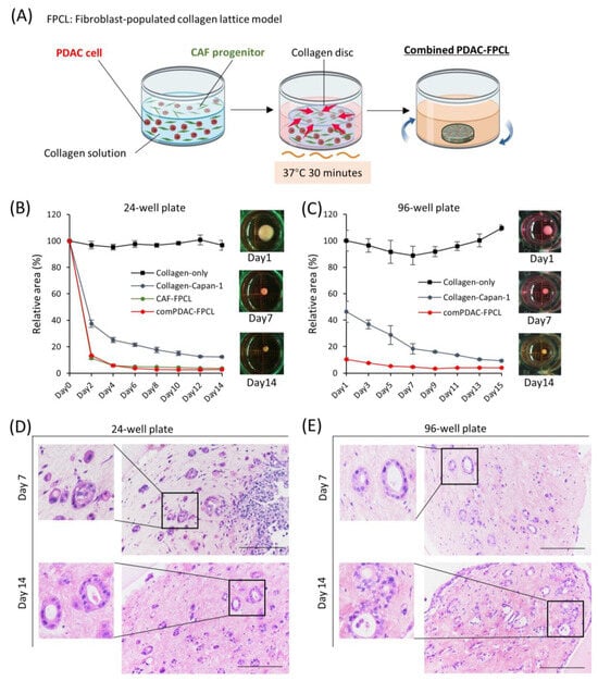 Morphological and contractile dynamics of comPDAC-FPCL models. (A) Graphical representation of the establishment of comPDAC-FPCL models. The rotating blue arrows represent the incubation in a shaker. The contraction formation of comPDAC-FPCL model in (B) 24- and (C) 96-well plates. The relative contraction area was calculated as a percentage of the Day 1 comPDAC-FPCL area. Results are presented as mean ± standard deviation (SD; n = 4). H&E staining of comPDAC-FPCL models in (D) 24- and (E) 96-well plates (Days 7 and 14). Scale bar: 200 μm.