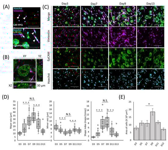 Differential morphological dynamics of CAFs within comPDAC-FPCL models. (A) Morphological comparison of CAF progenitors in the CAF-FPCL and comPDAC-FPCL models (Day 7). Capan-1 cells stained for epithelial cell adhesion molecule (EpCAM; Green), CAF progenitors stained for vimentin (Magenta), and nuclear stain for Hoechst (Cyan). Arrowheads indicate CAF progenitor morphologies. Scale Bar: 50 μm. (B) 3D imaging of the glandular structure of CAF-surrounded PDAC. Z: 30 μm. Scale Bar: 50 μm. (C) Dynamic changes in Capan-1 cell and CAF progenitor morphologies within the comPDAC-FPCL models. Scale Bar: 100 μm. (D) Dynamics of the quantitative value of CAF progenitors in the comPDAC-FPCL models. Shape Index indicates the ratio between the major and minor axis lengths. Results are presented as mean ± SD (n = 20). * p < 0.05, *** p < 0.001, N.S., not significant, unpaired Student’s t-test. (E) Dynamics of vimentin-positive cells in the mean cellular area. Results are presented as mean ± SD (n = 3). * p < 0.05, unpaired Student’s t-test.
