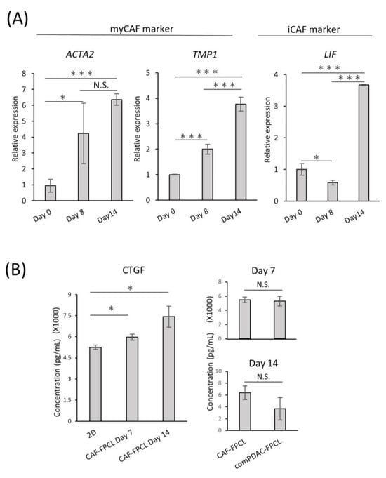 To investigate the differentiation heterogeneity of CAFs in the comPDAC-FPCL models, myCAF and iCAF markers were examined by quantitative PCR on Days 0, 8, and 14 (Figure 3A). The expression profiles revealed a surge in myCAF markers on Days 8 and 14, such as actin alpha 2 (ACTA2) and Tropomyosin (TPM1). Conversely, Leukemia Inhibitory Factor (LIF), identified as one of the relevant markers for iCAFs, exhibited elevated expression in the subsequent stages of comPDAC-FPCL formation, which may imply that the hypothesis of iCAFs differentiation within the model is sustained. The dynamics of gene expression are shown in Figure S2. Nevertheless, further experiments employing a broader range of markers are required to substantiate this speculation. In a complementary assessment, the secretion of connective tissue growth factor (CTGF), an indicator of mechanical stress, was quantified to gauge the physical and mechanical attributes of the FPCL models. Given that CTGF expression is intricately linked to mechanical stress responses, as evidenced by previous studies [38,39], it was imperative to examine both the CAF-FPCL and comPDAC-FPCL models on Days 7 and 14. The findings revealed that CTGF levels were markedly elevated in contrast to those in the 2D culture milieu, and no statistically significant divergence was observed between the CAF-exclusive and combined models (Figure 3B).