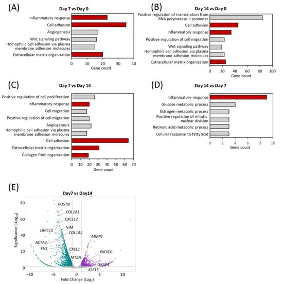 To understand the shifts in the global transcriptomic landscape during maturation of the comPDAC-FPCL models, RNA sequencing (RNA-seq) of the models was performed on Days 0, 7, and 14, followed by a Gene Ontology (GO) analysis. Remarkably, Days 7 and 14 highlighted a significant enrichment in biological processes integral to the active tumor microenvironment. These processes spanned areas such as “cell adhesion” and “ECM organization” and included the emergence of “inflammatory response” (Figure 4A,B, Tables S1 and S2). To further determine the temporal alterations that occurred between Days 7 and 14, a side-by-side comparison of gene expression was performed (Figure 4C,D, Tables S3 and S4). Notably, “inflammatory response” was exhibited in the comPDAC-FPCL model on Days 7 and 14, yet with distinct gene compositions. This implies that the comPDAC-FPCL model displayed varying complexity and biological resemblance on Days 7 and 14, resulting in different profiles of inflammatory-related genes. On Day 7, the comPDAC-FPCL models distinctly emphasized a synchronized tumor microenvironment. This was shown by the upregulated pathways, including “inflammatory response”, “cell adhesion”, “ECM organization”, and “collagen fibril organization”. In contrast, Day 14 presented a surge in metabolic pathways, incorporating processes like “glucose metabolic process”, “retinoic acid metabolic process”, and “cellular response to fatty acid”. Similar to these findings, the volcano plot analysis highlighted genes pivotal to the ECM. They are also known as CAF markers, namely POSTN, COL1A1, CXCL12, VIM, COL1A2, and LRRO15, and were predominantly expressed in the Day 7 configurations.