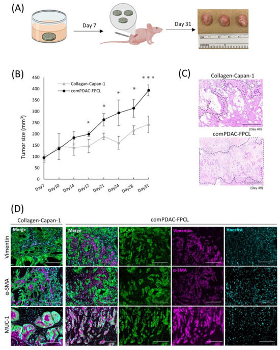 Validation of the tumorigenic potential of 3D tissue generated by the comPDAC-FPCL models in vivo. (A) Schematic diagram of the in vivo experimental workflow. (B) Tumor growth curve on Day 31. Results are presented as mean ± SD (n = 3). * p < 0.05, *** p < 0.001, unpaired Student’s t-test. (C) Histological analysis of H&E-stained tumor sections generated by Collagen-Capan-1 and comPDAC-FPCL. The stromal area is delineated by the black dashed line. Scale Bar: 200 μm. (D) Representative immunofluorescence image of Collagen-Capan-1- and comPDAC-FPCL-generated tumors. Capan-1 cells stained for EpCAM (Green) and MUC-1 (Magenta). CAF progenitors stained for vimentin/α-SMA (Magenta). All nuclear stains for Hoechst (Cyan). Scale Bar: 200 μm.