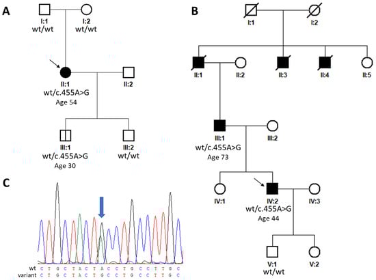Pedigrees and sequence chromatogram. (A) Pedigrees of family 1, (B) family 2, and (C) sequence chromatogram of the detected heterozygous TIMP3 variant (blue arrow) altering a tyrosine to cysteine NM_000362.5:c.455A>G p.(Tyr152Cys). Black squares and circles indicate clinically affected individuals, white symbols represent clinically unaffected individuals. Arrows indicate probands. Abbreviation: wt, wild type.