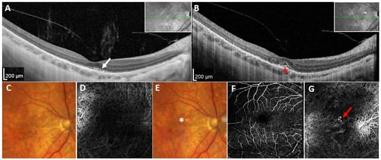 Six months later, the proband experienced deterioration of vision in the right eye over a 3-week period, and her BCVA decreased to 0.1, with a positive Amsler grid test for metamorphopsia. BCVA in the left eye remained stable. Biomicroscopic examination of the fundus showed the presence of a pigment deposition in the macular area (Figure 2E), while SD-OCT imaging suggested a type 2 CNV (i.e., passing through the RPE and located above the RPE in the subretinal space) [] with serous detachment of the neuroretina (Figure 2B). OCTA localized the CNV within the avascular complex layer. The widest measured subfoveolar extension of the CNV covered an area of about 0.16 mm2 and was localized in the inferonasal section of the fovea (Figure 2G). After CNV detection, the patient was treated elsewhere with anti-VEGF intravitreal injections.
