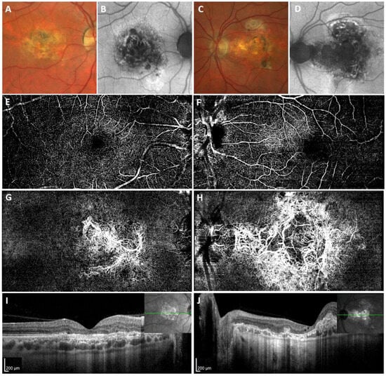 Retinal imaging in the proband from family 2. (A) Fundus photography of the right eye and (C) left eye showing severe atrophy of the whole macular region with patchy pigmentation. (B,D) Central macular hypoautofluorescence dominates in FAF images. (E,F) OCTA scans demonstrate no lesion within the deep vascular complex, while an extensive presumably long-lasting CNV is identified bilaterally in the avascular complex layer (G,H), corresponding to complete loss of the external retinal layers as demonstrated by transversal SD-OCT scans passing through the fovea (I) in the right and (J) left eye. Abbreviations: CNV, choroidal neovascularization; FAF, fundus autofluorescence; SD-OCT, spectral domain optical coherence tomography; OCTA, optical coherence tomography angiography.