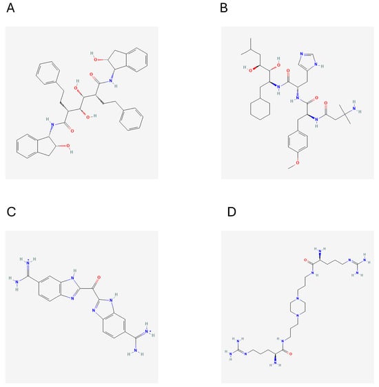 Shows the structural information of the 4 hit compounds (A) DB02704, (B) DB03395, (C) DB03213, and (D) DB15199.