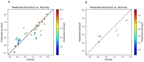Scatterplot of the 3D QSAR (A) training set values; and (B) test set values.