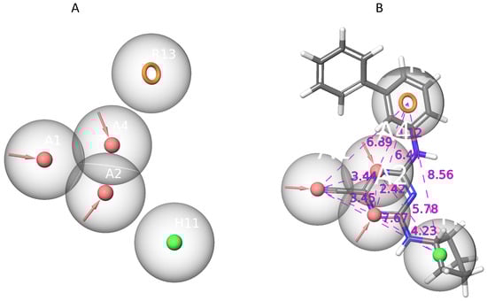 Chemical characterization of the selected pharmacophore. (A) the selected pharmacophore has a total of five features including three hydrogen acceptors (AAA), as well as one hydrophobic (H) and one aromatic ring (R). (B) The inner-features distance of the selected pharmacophore is displayed in angstrom (Å).