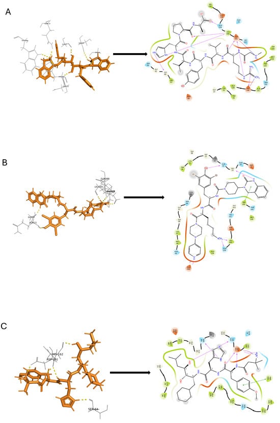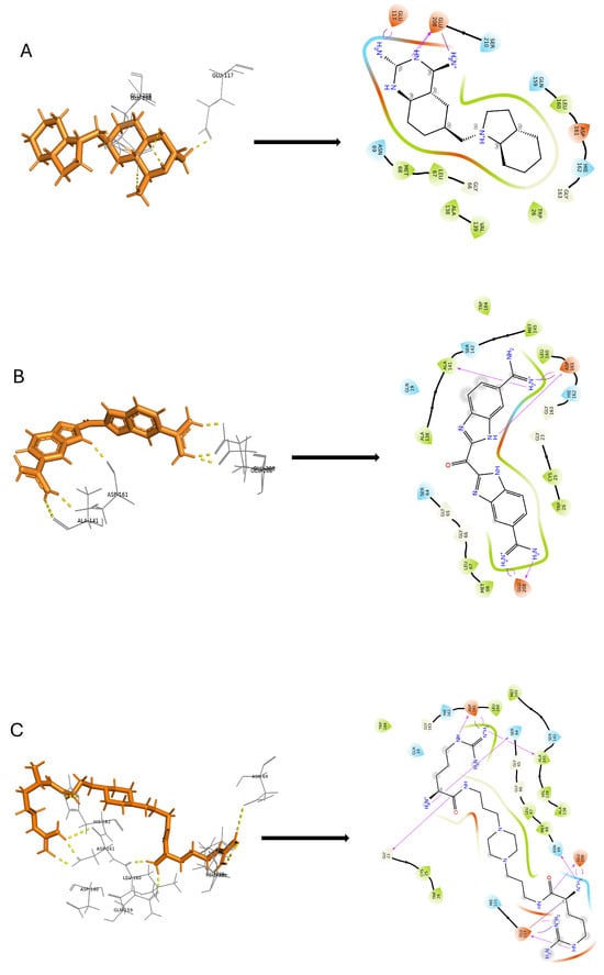 Deep learning modeling. Two-dimensional molecular interaction pattern of compounds (A) DB02559, (B) DB03213, and (C) DBQ5199 with cruzipain.
