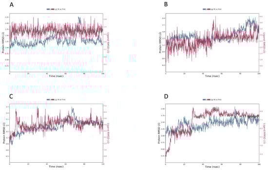 Shows the RMSD for compounds (A) DB02704, (B) DB03395, (C) DB03213, and (D) DB15199 with the protein cruzipain.