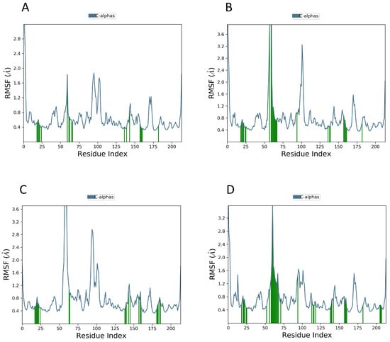 Shows the RMSF for compounds (A) DB02704, (B) DB03395, (C) DB03213, and (D) DB15199 with protein cruzipain.