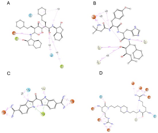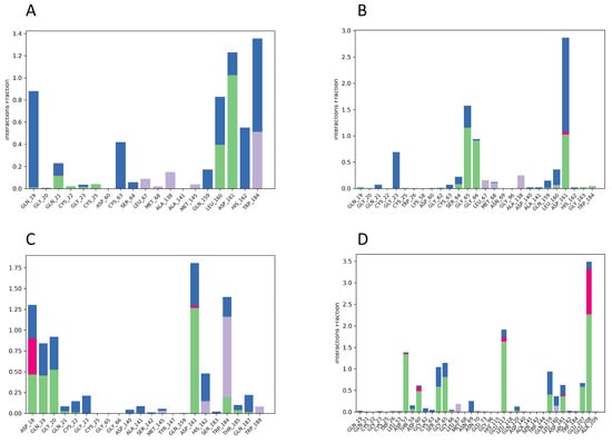 Two-dimensional structures show the count of the interaction fraction for compounds (A) DB02704, (B) DB03395, (C) DB03213, and (D) DB15199 with protein cruzipain.