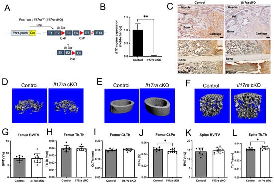 2.1. Deletion of Il17ra in Prx1+ Cells Leads to Subtle Improvements in the Intact Skeleton of Female Mice