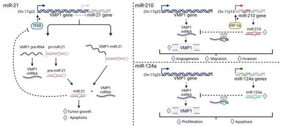 Relationships Between VMP1 and micro-Ribonucleic Acids (miRNAs) in Cancer. This figure schematically illustrates the relationships between VMP1 and miR-21, miR-210, and miR-124a, and their effects on cancer malignancy. MiR-21 is encoded downstream of the VMP1 gene. These genes can be transcribed separately, each being modulated by different factors, or they can produce a single transcript named VMP1-miR-21, giving rise to both VMP1 and miR-21. MiR-21 is known to promote tumor growth and inhibit apoptosis in various types of cancer. Moreover, VMP1 transcription can inhibit miR-21 expression, while miR-21 can inhibit Transcription Factor EB (TFEB)-mediated induction of VMP1 transcription. MiR-210 targets the 3′-untranslated region (3′UTR) of VMP1 messenger ribonucleic acid (mRNA), leading to the inhibition of VMP1 expression. Overexpression of miR-210 in cancer is associated with VMP1 downregulation and increased angiogenesis, migration, and invasion. MiR-124 also targets the 3′UTR of VMP1 mRNA, resulting in the inhibition of VMP1 expression. In this case, these effects lead to increased proliferation and decreased apoptosis. Figure created with BioRender.com.