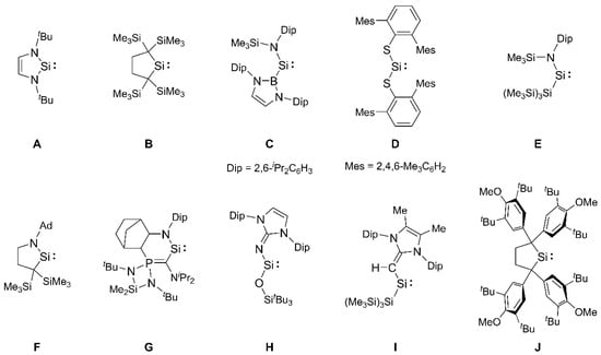 - Kira, M.; Ishida, S.; Iwamoto, T.; Kabuto, C. The First Isolable Dialkylsilylene. J. Am. Chem. Soc. 1999, 121, 9722–9723. [Google Scholar] [CrossRef]