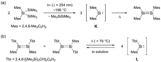 - Tokitoh, N.; Suzuki, H.; Okazaki, R. Synthesis, Structure, and Reactivity of Extremely Hindered Disilenes: The First Example of Thermal Dissociation of a Disilene into a Silylene. J. Am. Chem. Soc. 1993, 115, 10428–10429. [Google Scholar] [CrossRef]