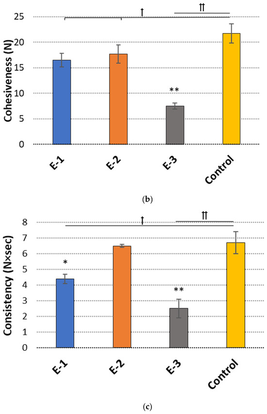 To provide deeper insight into the internal structures of emulgels, the textural studies of the formulations were assessed and the firmness, cohesiveness, and consistency measurement data are displayed in Figure 2.