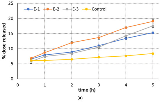 In terms of the topical delivery of an anti-inflammatory agent, it is important to ensure a relatively fast and steady drug release profile to initiate drug action on the skin. A clear impact of CS/PO weight ratio on the HTZ release behavior was noticed in this study. Within the first stage of the test (Figure 3a), the amount of the drug released from the designed formulations ranged from 8% to 20% of the total drug dose, and formulation E-2 (with CS/PO weight ratio 6:4) demonstrated the fastest initial release rate among the tested samples. Interestingly, the dissolved HTZ fraction observed in the acceptor medium was found to be irrespective of the CS ratio in the carrier composition, and emulgels E-1 and E-3 with reversed weight ratios of CS/PO (8:2 vs. 2:8) displayed comparable release patterns within the first 5 h of study. According to pharmacopeia guidelines [32], dissolution studies were continued until at least 80% of the drug appeared in the acceptor medium (t80%). As shown in Figure 3b, the dissolution lasted up to 96 h and faster releases of HTZ were observed for CS/PO emulgels than for the commercially available product. Emulgel E-2 showed the highest release of HTZ with more than 80% of drug released within 60 h of the test. Slower drug dissolution was achieved for emulgel E-1, which reached t80% after about 80 h. The observed delay in the HTZ release rate from preparation E-1 (with a CS/PO ratio of 8:2) resulted from a greater amount of CS, which was responsible for the formation of a thicker, gel-like barrier for diffusing drug particles in an acceptor environment with pH 5.5 (Figure 3b). This is in accordance with previous findings where the presence of CS in the drug carrier was associated with a prolonged release pattern and an extended dissolution rate of the active substances [33,34]. Interestingly, control studies revealed profoundly lower onsets, with less than 15% of drug release within the 96 h period (Figure 3b). This most likely resulted from the more compact structure and greater textural properties observed in the reference preparation (Figure 2). Surprisingly, formulation E-3, which had the lowest textural behavior, displayed retarded dissolution, and 80% of its HTZ was released after 96 h. A slower pattern of dissolution observed in the studies with formulation E-3 was most likely due to the presence of the hydrophobic oil matrix, which hindered drug diffusion by limiting the entrance of the acceptor fluid.