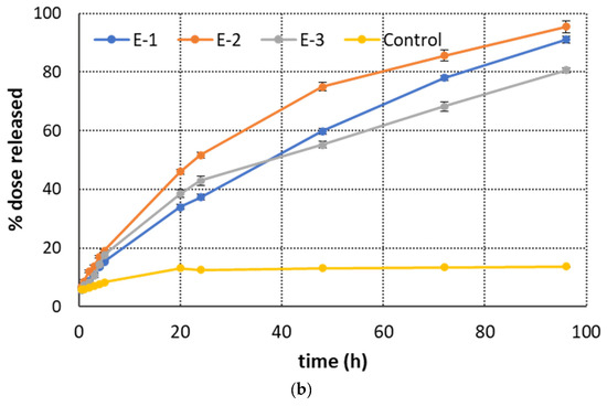 In vitro HTZ dissolution profiles: (a) initial stage of the studies and (b) emulgels differing in chitosan/pomegranate oil weight ratio compared to the reference commercial cream with HTZ acetate (Control); mean ± S.D.; n = 3.
