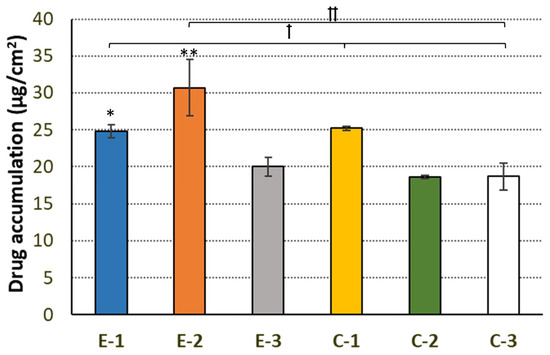 In vitro retention (expressed as the amount of drug per membrane surface area) of HTZ embedded within the emulgel formulations E-1–E-3 in StratM membrane measured after 24 h. Controls: CS gel base with HTZ (C-1), PO with HTZ (C-2), and pure HTZ (C-3). Mean ± S.D; n = 4. * and ** represent differences between the HTZ-loaded formulations with p ≤ 0.05 and p ≤ 0.01, respectively; † and †† symbolize differences with p ≤ 0.05 and p ≤ 0.01, respectively, as compared to the control.