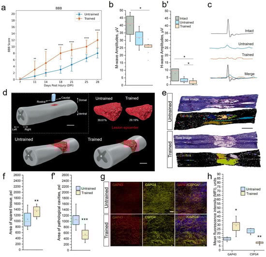 Treadmill training restores motor function, maintains tissue integrity, and supports axonal growth at 28 dpi (3 weeks of motor training). (a) Locomotor recovery measured by BBB rating scores. Maximum score—21. The electrophysiology results of M-wave amplitudes (b), H-wave amplitudes (b’) and somatosensory evoked potentials (SEPs) (c). (d) Three-dimensional reconstructions of the lesions. Scale 1 mm. (e) Representative images of quantitative assessment of neural tissue integrity in longitudinal sections (5 mm rostral to 2.5 mm caudal) of Untrained and Trained groups. Digital RGB color images (raw) of the spinal cord after hematoxylin–eosin staining. Binary inverted images after conversion to 8-bit with the application of Huang’s automatic threshold method and overlay masks. Identified cavities are colored, larger than 200 µm2. Scale 1 mm. Area quantification of spared tissue (f) and pathological cavities (f’). (g) Expression of growth-associated protein 43 (GAP43) and chondroitin sulfate proteoglycan 4 (CSPG4) in the spinal cord, longitudinal section, 6–8 mm caudally. Confocal microscopy. Scale 20 µm. (h) Quantitative graph of the GAP43 and CSPG4 areas. For BBB test (a): Mann–Whitney test with Bonferroni correction; for EMG (b,b’): Kruskal–Wallis test with Dunn’s multiple comparison; for tissue integrity analyze (f,f’) and assessment of axonal growth (h): Mann–Whitney test. For all (a,b,b’,f,f’,h) values expressed as medians (minimum, maximum, and first and third quartiles (25th and 75th percentiles)): Mann–Whitney test. For all (a,b,b’,f,f’,h) values expressed as medians (minimum, maximum, and first and third quartiles (25th and 75th percentiles)), x—mean, +—outliers, rat/Untrained and Trained, rat/Intact group for (a,b,b’) and rat/group for f, f’,h; * ; ** ; *** ; **** .