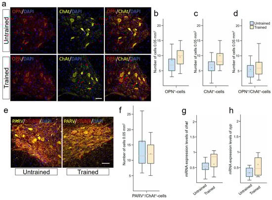 Behavioral assessment, EMG, and tissue preservation indicated the restoration of functional connections in the spinal cord under rehabilitation conditions. These results prompted us to evaluate the phenotype of thoracic neurons at 6–8 mm caudal to the epicenter of the injury, which interact during the activation of lumbar circuits during training. In examining combinations of OPN/ChAt (Figure 2a–d) and PARV/bTubIII (Figure 2e,f), no significant differences were found in the VH of the spinal cord between the Untrained and Trained groups. There were also no significant differences observed in the expression of the chat gene (Figure 2h). Additionally, we analyzed the potential enhancement of synaptogenesis. However, no significant differences in the expression of the syp gene were found between the groups (Figure 2g).