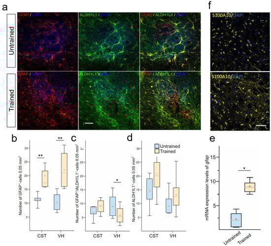 Treadmill training promoted the development of anti-inflammatory reactive astrocytes. (a) Combined staining for aldehyde dehydrogenase 1 family member L1 (ALDH1L1) (green) and glial fibrillary acidic protein (GFAP) (red). ALDH1L1 marks both the cell bodies and extensive processes of astrocytes in the CST in spinal cord, 6–8 mm caudal to the epicenter of injury. GFAP labels the intermediate filament cytoskeleton of astrocytes. Confocal microscopy. Scale 100 µm. Quantitative graphs of different populations of astrocytes: GFAP+-cells (includes GFAP+/ALDH1L1− and GFAP+/ALDH1L1+-astrocytes) (b), only GFAP+/ALDH1L1+-cells (c), and stable population of ALDH1L1+-(or GFAP−/ALDH1L1+)-astrocytes (d). qRT-PCR was performed to determine the expression of gfap (e) at 28 days post-injury (dpi). The data are expressed as . (f) Confocal microscopy S100A10 cells in the ventral horns (VHs) of the spinal cord, 6–8 mm caudal to the epicenter of injury. Nuclei are stained with DAPI (blue). Scale 100 µm (a,f). For all (b–e): Mann–Whitney test. Values are expressed as medians (minimum, maximum, and first and third quartiles (25th and 75th percentiles)), x—mean, rat/group, * ; ** .
