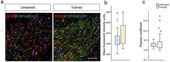 Another representative marker gene of astrogliosis is CSPG4, often associated with so-called NG2 cells (the third lineage of astrocytes identified in SCI) []. It has been shown that NG2 glia in the spinal cord after injury can generate a small portion (5%) of new astrocytes in both gray and white matter []. In our study, we demonstrated that the colocalization of GFAP and CSPG4 markers is very weak (Pearson coefficient less than 0.1) in both groups, with an insignificant reduction in the training group. This corresponds to the findings of other studies on the lack of significant contribution of astrocytes to the change in CSPG4 expression [,] following SCI, and likely indicates that such GFAP expression is merely a temporary activation of the GFAP gene. Overall, the NG2 glia population remained stable after training, with no significant differences in CSPG4 expression between the two groups.
